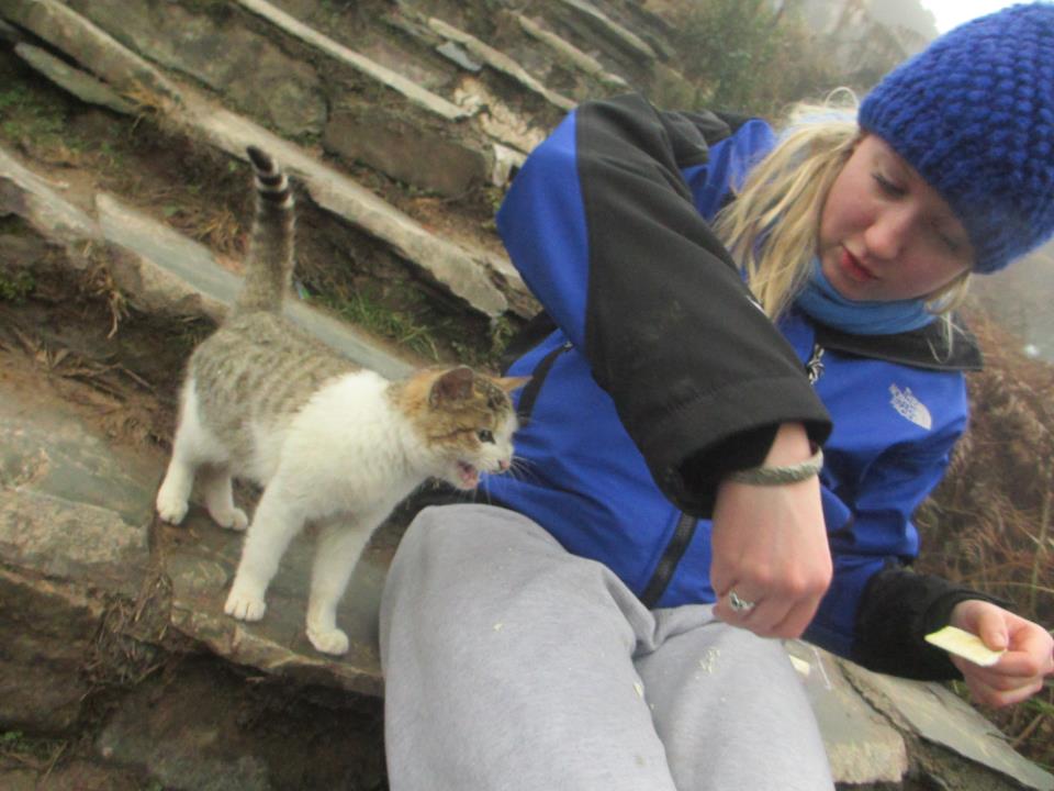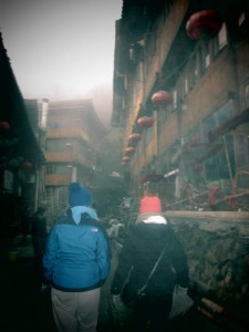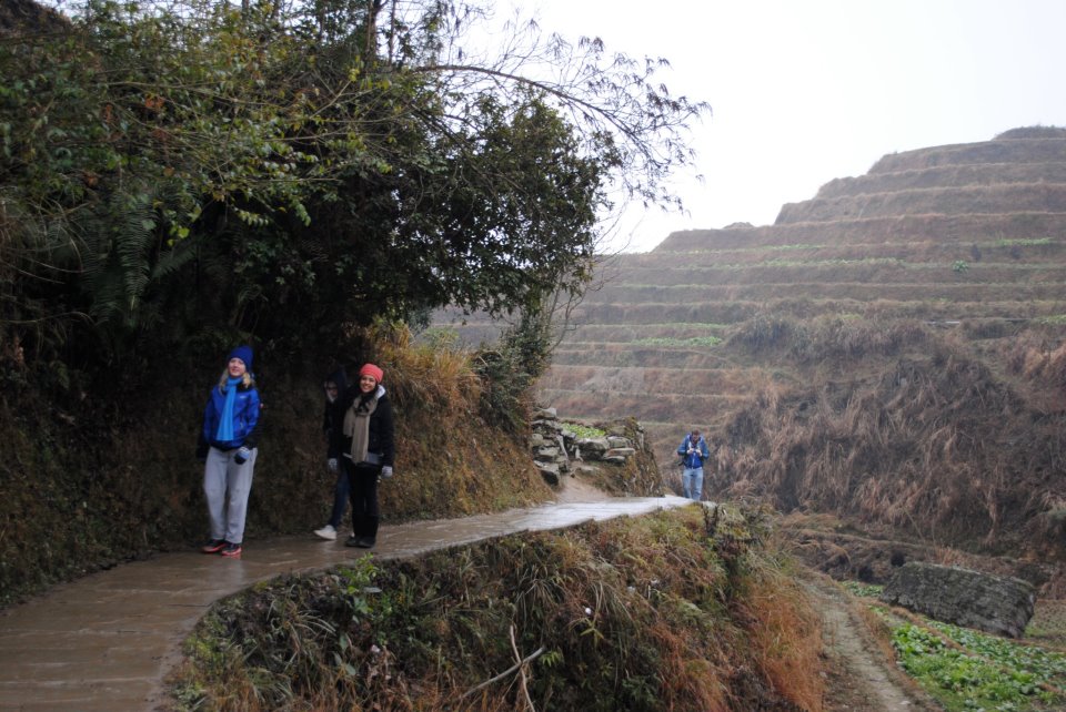 After that we kept driving and ended up at the actual bridge we were supposed to go to, the first one was a decoy! But you had to pay to get into this one and we were all to cheap to do that so we admired it from afar, had some bathroom adventures and then headed for the rice terraces. The rice terraces are at a high altitude and the higher we got the foggier it was. Near the top we couldn’t see too much, but it was still really cool. We walked through Ping’An a village accessible only by walking thats on the terraces, up in the mountain and ate rice in bamboo. Three of us kept walking trying to get near the top and the visibility got realllllly bad. It was deserted at the top, like a ghost town because it’s not tourist season. We met a cat who seemed hungry and being sensible I decided the only thing to do was name it Wallace, feed it the stale crackers we had and lure it into my lap. He didn’t follow me back and I won’t lie to you, it broke my heart a little bit. When we were walking back down we got a call that the driver really wanted to leave and it was getting dark so we started to book it. By the time we were driving down the mountain it was dark and foggy and for the first time I actually fastened my seatbelt. Despite the car almost breaking down we made it back safe and sound to Guilin!